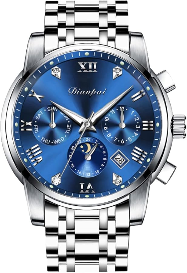 تصميم أنيق: وجه أزرق عميق مع مؤشرات معدنية، و سوار من الفولاذ المقاوم للصدأ يضفي مظهراً كلاسيكياً وقوياً.
